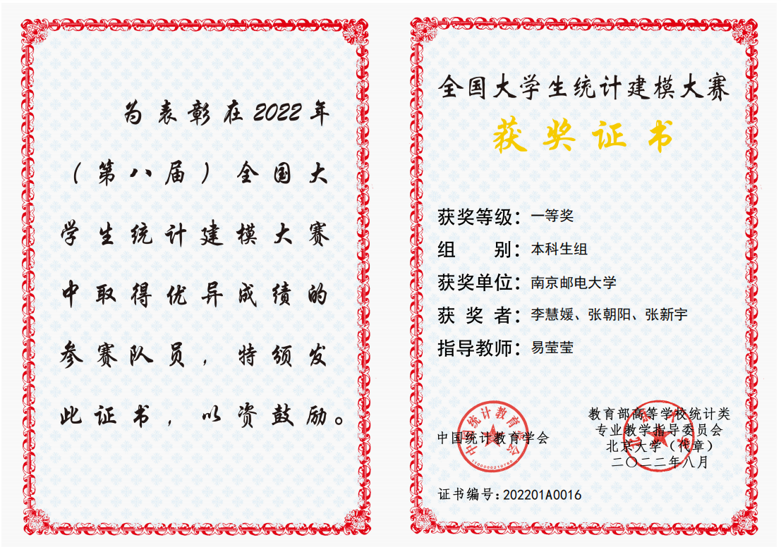 我院學(xué)生在第九屆全國(guó)大學(xué)生統(tǒng)計(jì)建模大賽本科生組中獲得“一等獎(jiǎng)”